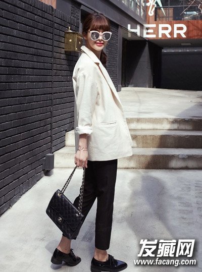 文艺范扎发发型,平刘海侧扎发搭配简洁白色系西装,简单干练,凸显女人味。