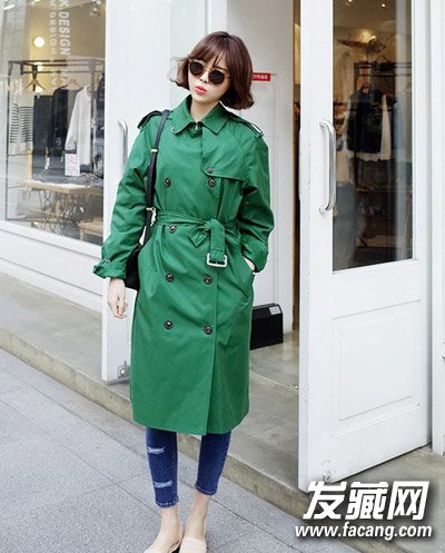 韩式短卷发发型,蓬松发尾烫发加上染发设计很好的展现女生的时尚个性,绿色风衣搭配也是极具春日色彩的。