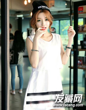 清新灵动的半身运动款这裙子,一款韩式的低马尾扎发发型,搭配上帽子后勾勒出别致的时尚与个性的一面来,整个造型颇为时尚。