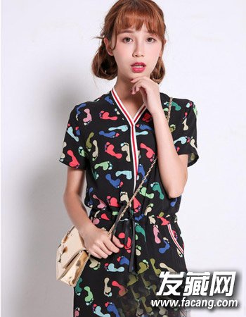 这一款深色系的服饰加上可爱的双花苞头发型。甜美的平刘海发型勾勒出别致的时尚与个性来。而且也是小个子MM凸显高挑的不二选择哦。