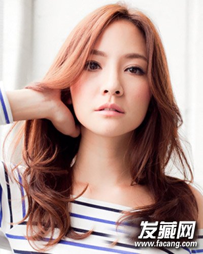 标准的国字脸发型不仅时尚而且显气质感,个性的长卷发加上红棕色的发色颇显气质范,两侧的外卷鬓发完美的达到修颜感。