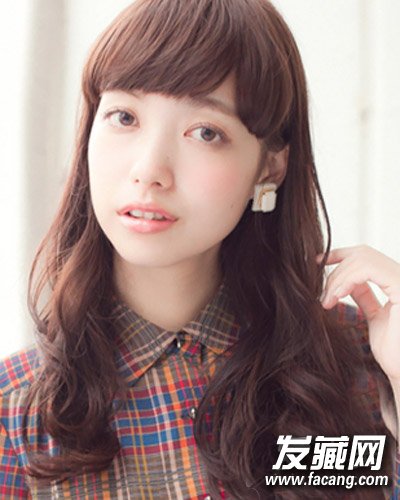 气质的日式长卷发发型,厚重的刘海很好的改变了脸型的不足,加上深栗色 的发色不仅时尚而且有气质感。