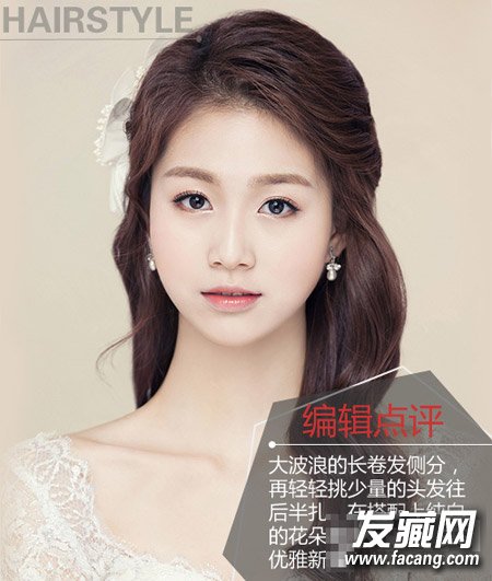 大波浪的长卷发侧分,再轻轻挑少量的头发往后半扎,在搭配上纯白的花朵发夹,就轻松变优雅新娘。