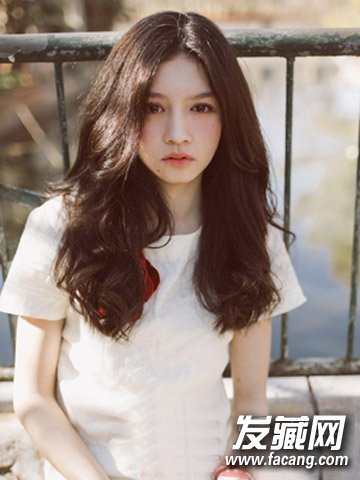 这款发型是很适合大脸MM瘦脸的一款发型,偏分的长发烫发留出长斜刘海遮住小半边脸修颜瘦脸,棕色的披肩长发很显白嫩。
