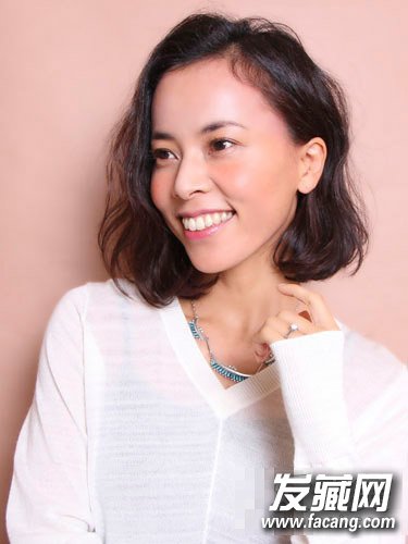 大侧分的刘海,厚重的蛋卷发散落于脸颊两旁,一边头发别于耳后,十分有OL的气质。
