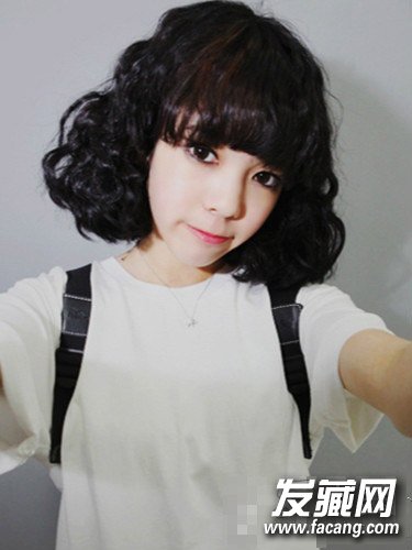 大波浪的的头发自然垂于肩上,几根卷发巧妙的修饰了脸型,很适合头发少的女生哦。