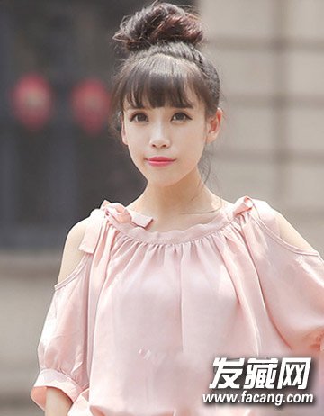 可爱甜美风式的一款鸭蛋脸女生适合的发型设计,厚重的齐刘海造型再配合简单而高耸的花苞头扎发设计活力中更添可爱清爽感。