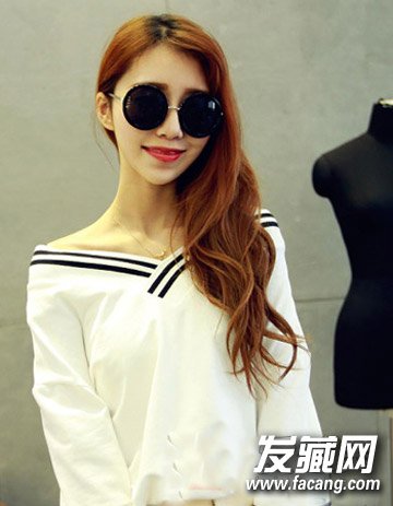 潮流气质感十足的一款鸭蛋脸女生适合的长发设计,无刘海式的偏分长发设计再配合时尚的棕色染发,简单的侧边长发烫发设计与一副简单的墨镜相搭同样潮流感十足。