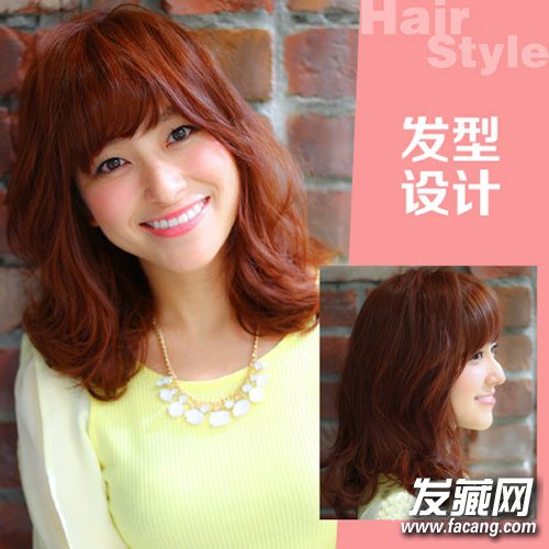 外翻卷发设计散发成熟魅力,酒红色染发让肤色白嫩,整款发型显得清纯有活力。微斜刘海搭配两边头发也能遮盖脸颊小肉。