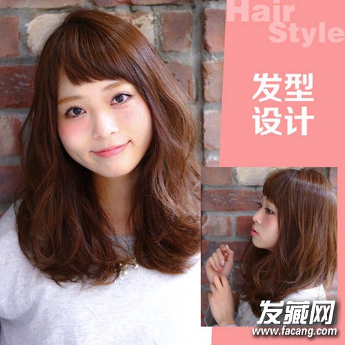 微斜短刘海可爱俏皮,大波浪卷发随意披散显蓬松在视觉上有瘦脸的作用,棕色染发让皮肤显白。