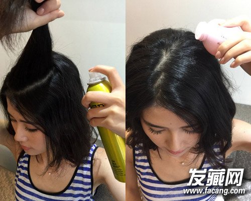 使用澎松喷雾或干洗发造型产品均匀喷撒于发根及发中。