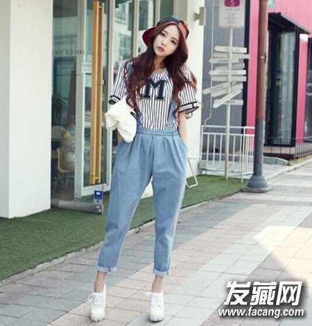 中分卷发发型在今年也很流行,很多韩国明星都是这样弄发型,波纹式的卷发加上深棕色染发颜色,时尚更显白,穿上背带裤,潮感十足。