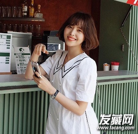 一款韩式短发发型,齐刘海波波头设计甜美减龄,内蓬烫发完美修饰脸型,大圆脸也能很可爱。