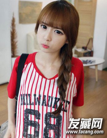 齐刘海的造型设计一直以来都是校园女生们的最爱,增添着女生的可爱甜美风还有简单的修颜效果,再配合低调的深褐色染发与简单的侧边辫子编发同样甜美迷人。