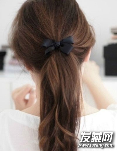飘逸秀丽甜美梦幻的巧克力色长发,配合自然蓬松的纹理烫,打造的轻盈卷发,借助一根黑色缎带,简单绑成蝴蝶结状束起高马尾,时尚大方清新宜人,将女孩子柔美特质展现的淋漓尽致!