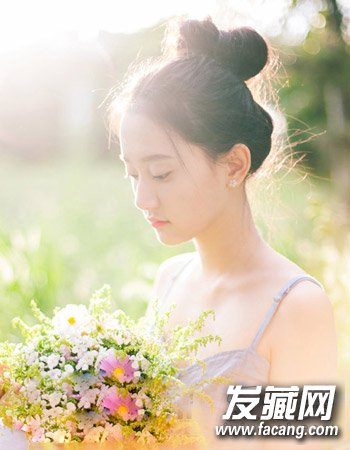 十分小清新的一款花苞头盘发发型,清爽的露额发型设计。正是这个季节发型的首选哦、。