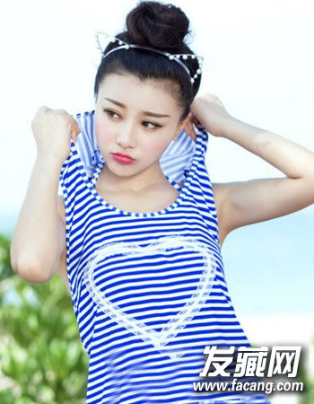 精致的花苞头盘发与可爱发饰的搭配令造型看起来更加透着少女气质。清爽的无刘海发型与个性的造型设计十分讨喜。
