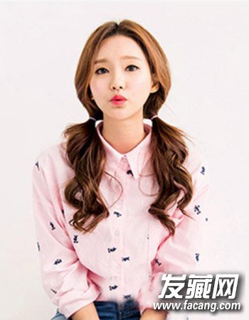 很显可爱甜美风式的一款韩式中分发型图片,利用的是简单的中分造型设计,搭配长卷发形式的双马尾扎发造型更添女生十足的青春活力感。