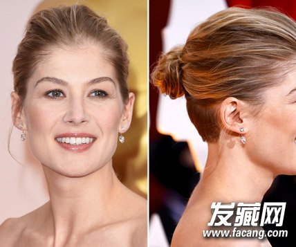 ROSAMUND PIKE发髻很适合休闲运动,即使头发再短一些也很好看,用梳子或者手指将两个耳朵周围的头发全部梳在一起,将它扎成一个马尾,再将马尾和剩余的头发拧在一起固定成一个发髻,记得喷上发胶。