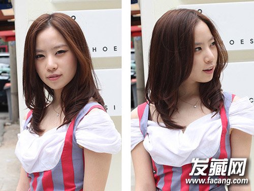 四六分的刘海自然内扣,轻松帮助MM打造小脸,发尾层次感强、细碎内扣,让发型动感轻盈,有夏天的味道,棕红色染发时尚感强,让MM看起来更白。