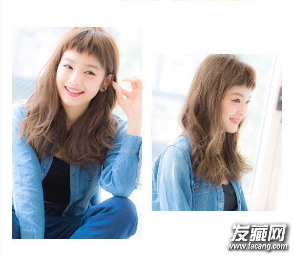 极短的眉上刘海非常的俏皮时尚,突出MM俏丽的五官,蓬松微卷的头发披在双肩,让MM的连看上去更小,棕色染发时尚加分。