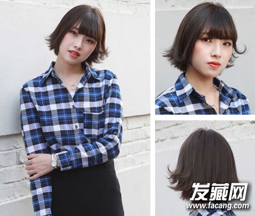 这款短发个性十足,非常适合这个特别的秋天,头发直而整齐,齐刘海稍微遮过眉毛,隐约露出额头,发尾烫得向外微翘,非常特别。