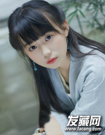 古风散发出来的一款半扎发发型,可爱平刘海与圆脸搭配起来,将造型打造出半扎半披的造型不仅时尚而且颇有气质感。
