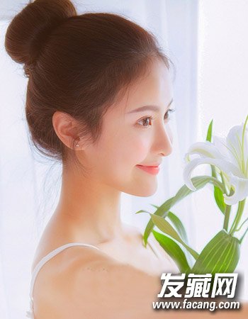 可爱的丸子头盘发与清爽的露额发型搭配起来,清爽的露额发型勾勒出别致的时尚感来,而且花苞头的设计完美的勾勒出清纯感来。