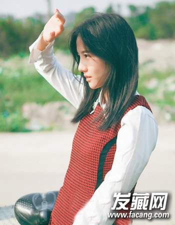 气质的中分与中长直发发型搭配起来,这种学生的中长款发型的设计不过份不做作完美的展现出学生的清新感来。