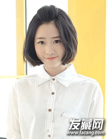 搭配的清新低调的自然乌黑发色来增添女生十足的清纯气质风,再搭配清爽的露额造型设计与简单的中短发波波头活泼可爱萌态十足。