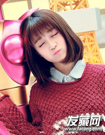 同样是清新可爱的空气感刘海造型设计,再搭配深棕色的自然发色与齐肩形式的中短发内扣波波头造型,同样可爱甜美更添清新学院风。