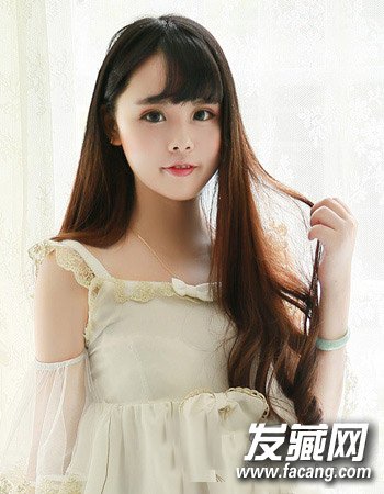 内扣形式的齐刘海造型设计可是最显女生十足的可爱甜美风的了,而搭配清新低调的发色与及腰形式的长卷发造型设计更添十足的唯美清纯萌态感。