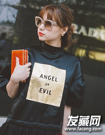 很有个性的一款中短发扎发发型,甜美的空气刘海与时尚的墨镜搭配起来勾勒出别致的时尚感来,清爽且自然。