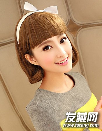 以甜美可爱风为主的齐刘海设计为主,再搭配时尚的栗色染发颜色与中短发形式的内扣波波头造型,一个简单的发箍更添青春学院风。
