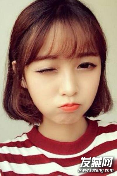 发型3 空气刘海搭配短发造型轻松可爱,及眉长度刚好修饰脸型,发尾稍稍弯曲外翘,活泼灵动。