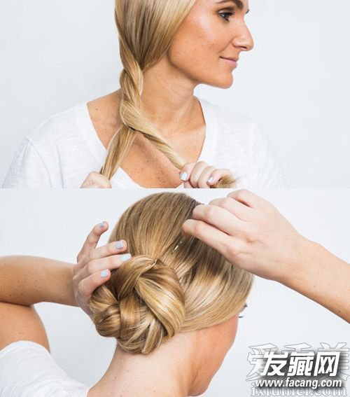 将所有的头发分成两股,拧在一起,然后盘在脑后,用小发夹别住就可以了。