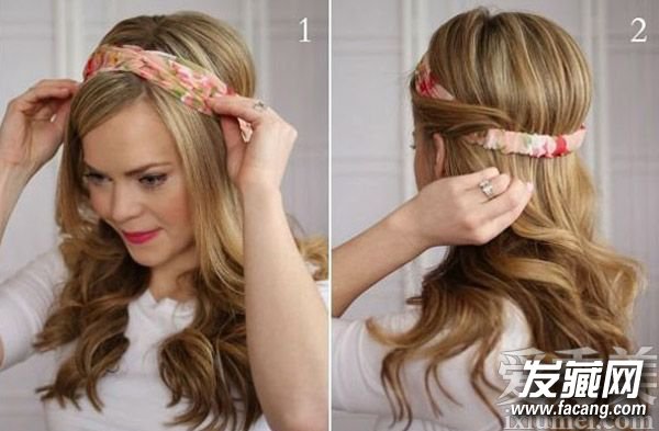 首先把发带戴在头上,注意前边要留出适当的头发,然后将留出的头发别在脑后的发带里。