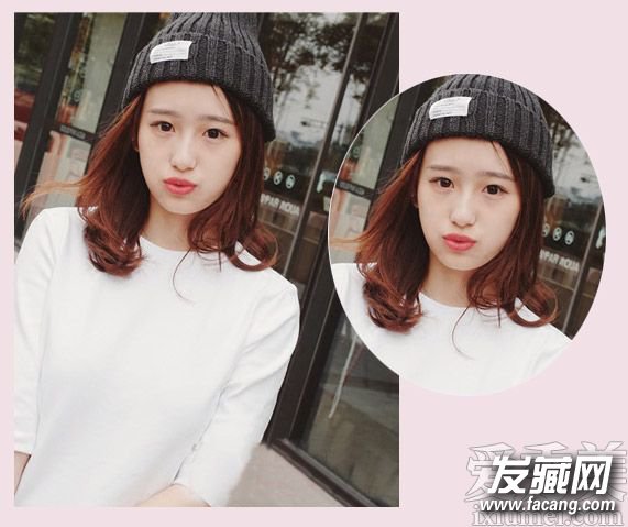 再利用的是清爽的露额发型设计将鸭蛋脸女生精致而显圆润的脸型呈现得更加可爱,而棕红色的中长发染发更显女生肤色的白皙感。