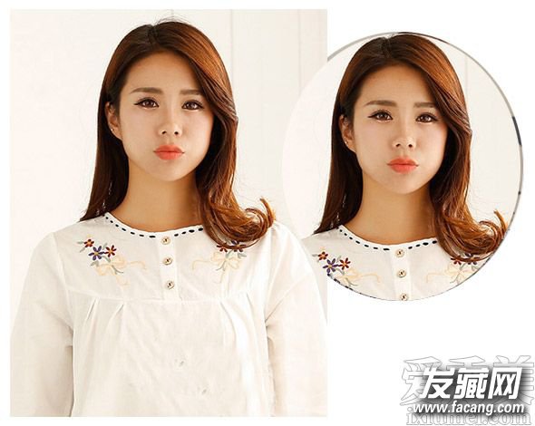 简单利用的是温暖而明亮的橘黄色染发颜色来衬托出女生肤色的白皙红润感,而搭配偏分的露额发型与中长发形式的发梢外翻的烫发设计更添矮个女生的活泼可爱风。