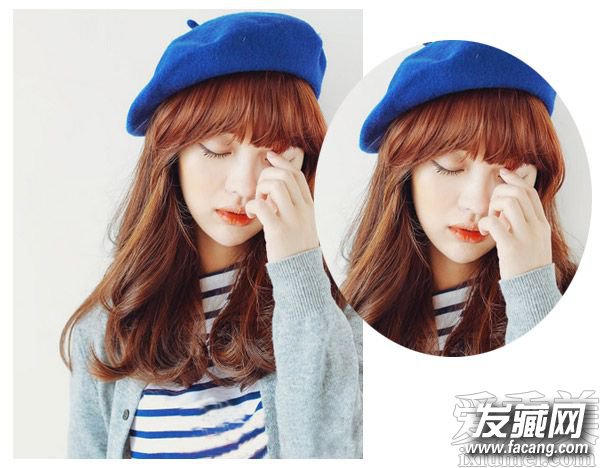 这一款简约的中长卷发发型,气质的小卷与层次感的设计搭配起来,甜美的平刘海与帽子更显时尚与个性的一面,十分抢镜哦。