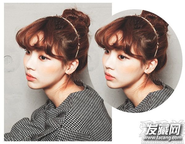 可爱的花苞头也不错哦,这样盘起来搭配上一款时尚的内卷刘海点缀上精致的发饰显得十分有气质,整个造型刘海是亮点。