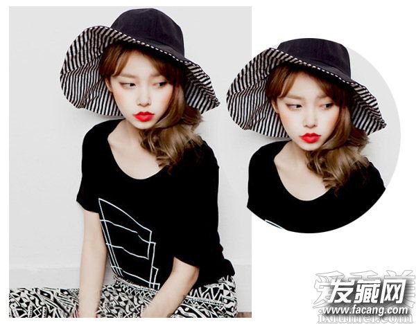 这种简约的复古风也是不错的选择哦,气质的中分与侧边卷发搭配起来,时尚的棕色发色点缀上个性与时尚的一面来,大大的礼帽十分抢镜。