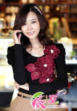 韩范儿浓重的中长卷发,优美的大弧度发丝放在肩上,低调的颜色,给人一种文静的小成熟魅力,偏分的造型上点缀一个清淡的头饰,清新的淡雅女人气息。