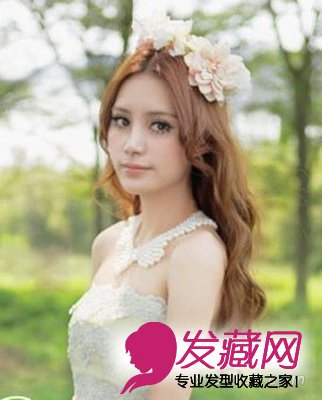 一款淑女型的中长发烫发,中长度的烫发发型设计,多显轻熟女文静贤淑的优雅气质,棕黄色的染发颜色显得很洋气,花环点缀中长发烫发,唯美如仙子般美丽。