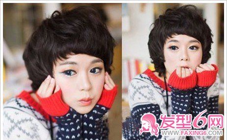 青春可爱风——蓬松的短发纹理烫,自然的黑色,文静大方,圆形弧度的刘海修饰精致完美的脸型,糖果的妆容更显少女的魅力。