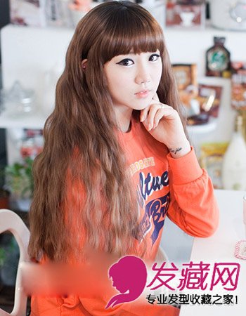 柔顺的内扣韩式刘海是不少女生喜欢的,凸显出眼睛的有神之余可以带出甜美感,披散的麦穗烫发显露出别致的气质感来,造型虽然简单却也时尚。