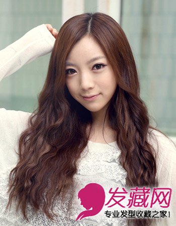 颇有气质的中分造型是不少妹子的修颜利器,可以完美地衬托出小脸来,相信搭配上麦穗烫发更为别致与有个性哦,时尚的栗色发色很显肤白。