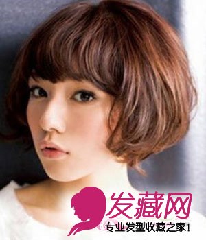 一款有着日系风格的女生烫发。齐刘海,是瘦脸的法宝之一,也是最能体现MM们的甜美气质的。烫出轻微的内卷效果,比服帖的刘海更具有灵动气息。蓬松短卷发,显得轻盈动感。棕色系的染发,打造出时尚感和日系范。