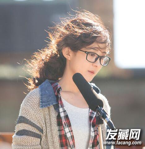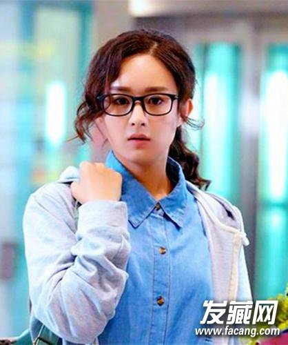 赵丽颖把刘海也烫成玉米烫,把后面的头发扎起来,佩戴一副黑镜框的黑眼镜,理性、学霸的研究生的形象马上出来。