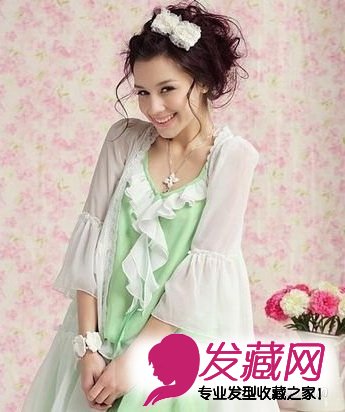 烫发盘发发型,也可以增加女生的甜美度。凌乱的发丝加上白色蝴蝶结发饰,两鬓间散落几缕卷发丝,清新而甜美。